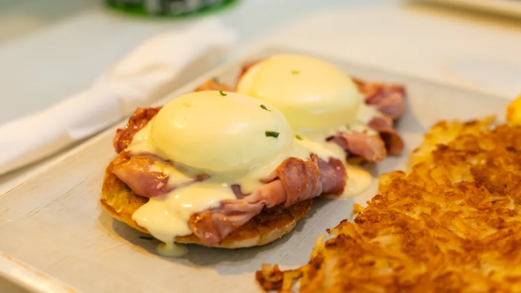 Poached Eggs, Topped with Hollandaise Sauce on Toasted English Muffin. Served with Choice of Shaved Ham, Bacon, Sausage, or Turkey.